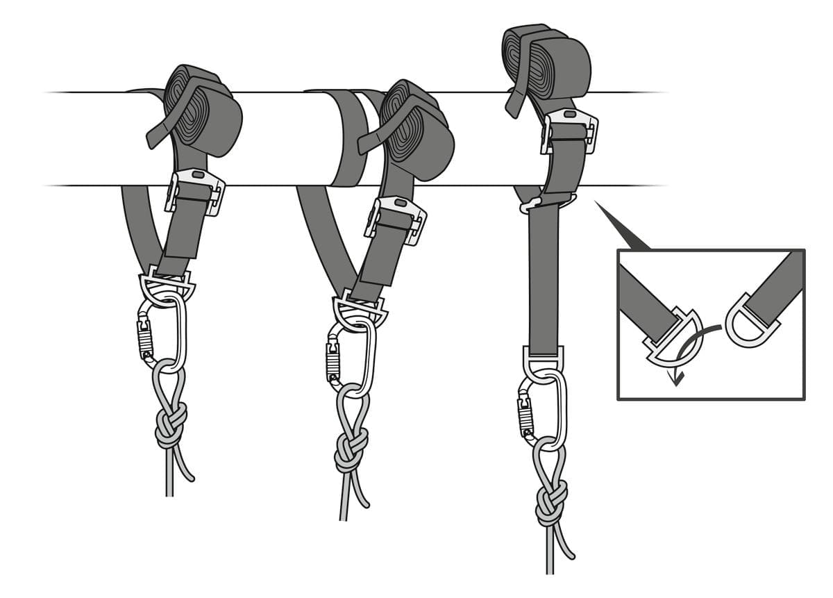 CONNEXION VARIO is a durable and adjustable anchor strap equipped with two forged steel attachment points. It offers several configurations for setting up an anchorage directly on an anchor or around a suitable structure. The strap length is adjustable, thanks to an adjustment buckle. A system keeps the remaining webbing stowed. It is available in two versions (30 to 200 cm and 200 to 400 cm).